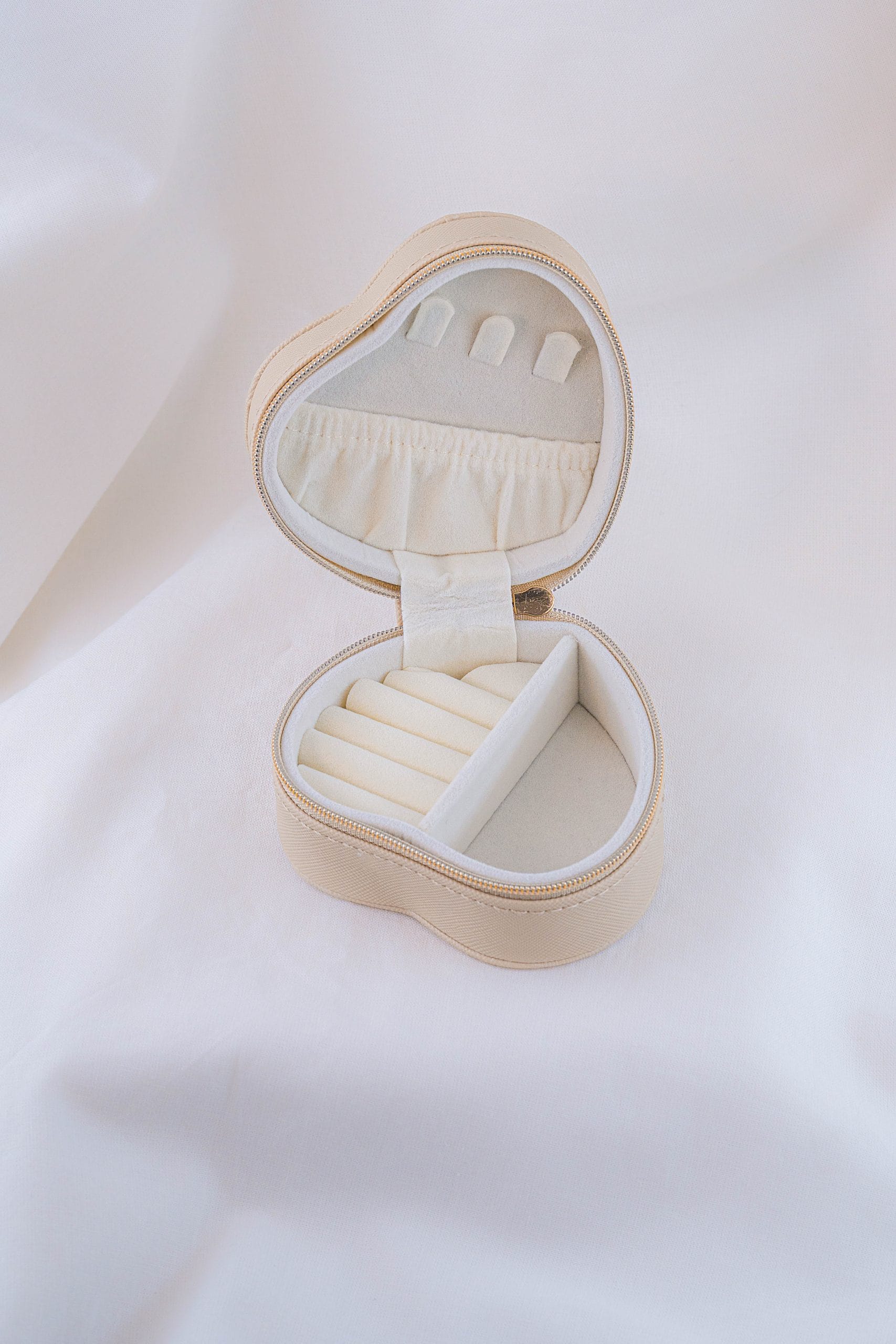 Nuestro joyero viajero es el compañero ideal para llevar tus accesorios favoritos de forma organizada, segura y con mucho estilo. Su delicada forma de corazón y su acabado neutro y elegante lo convierten en una pieza tan linda como funcional. Cuenta con un interior suave y acolchado, diseñado para proteger tus joyas del roce y los golpes. • Ranuras acolchadas para anillos • Ganchos para aretes • Compartimentos independientes para collares, pulseras y piezas pequeñas • Cierre con cremallera metálica segura que mantiene todo en su lugar • Diseño compacto, práctico y femenino • Ideal para viajes, bolsos, regalos o para organizar tus joyas en casa sin ocupar mucho espacio. No incluye accesorios.
